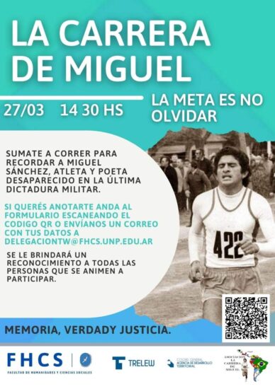En el marco del Día Nacional de la Memoria por la Verdad y la Justicia, la Facultad de Humanidades y Ciencias Sociales de la Universidad Nacional de la Patagonia San Juan Bosco (UNPSJB) y la Municipalidad de Trelew realizarán la «Carrera de Miguel» en homenaje al poeta y atleta Miguel Sánchez y a todos los desaparecidos en la última dictadura cívico-militar. La competencia se realizará el domingo 27 a las 14.30 horas bajo la consigna «La meta es no olvidar».