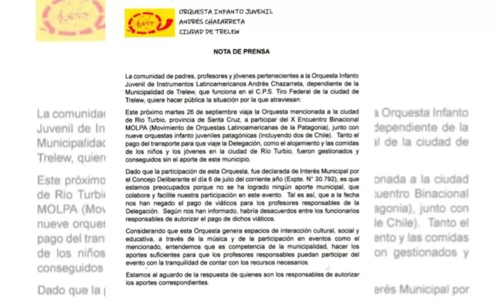 Según mencionó Nelson Colin, Director de la orquesta, en comunicación con Radio Chubut, los integrantes de la Dirección de Cultura, Manuel Lopez y Daniela Vidal, les habían asegurado el 50% de los viáticos para poder viajar y el día jueves les informaron que no lo iban a poder hacer.