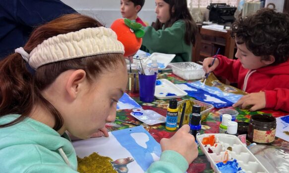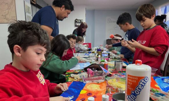 En paralelo, se desarrolla el Taller de Pintura con Relieve, a cargo del artista plástico Carlos García, los miércoles y viernes en el mismo horario. Allí, las infancias exploran técnicas mixtas y relieves texturados con elementos naturales como sal gruesa, maicena, arena o ramas de tamarisco, combinando figuras prediseñadas con composiciones de fondo que estimulan la percepción y la creatividad.