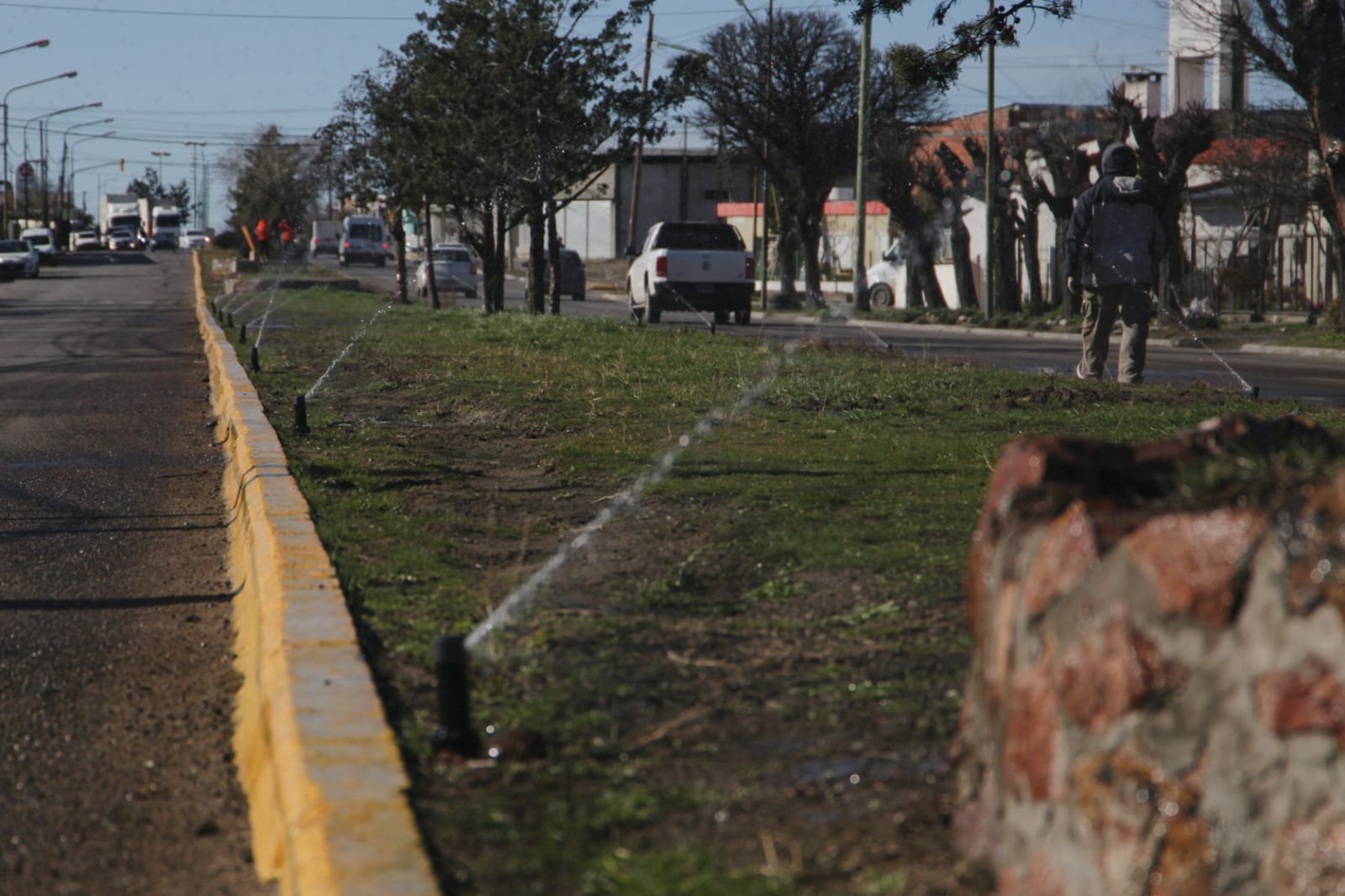 El intendente de Rawson, Damián Biss, acompañado por el secretario de Planificación, Obras y Servicios Públicos, Fernando Vosecky , pusieron en funcionamiento el nuevo sistema de riego por aspersión en uno de los principales ingresos a la ciudad Capital por Ruta 25.
